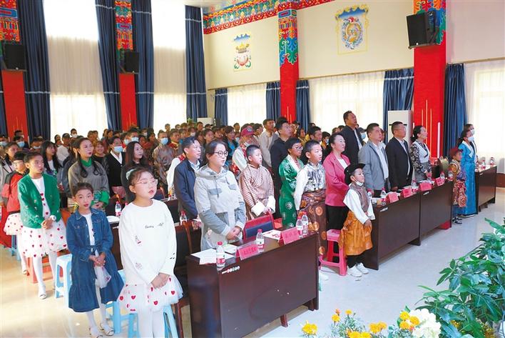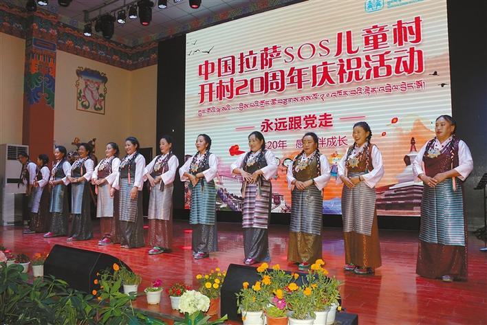 在中國拉薩SOS兒童村開村20周年慶祝活動上,SOS村全體干部職工和孩子們共唱國歌。