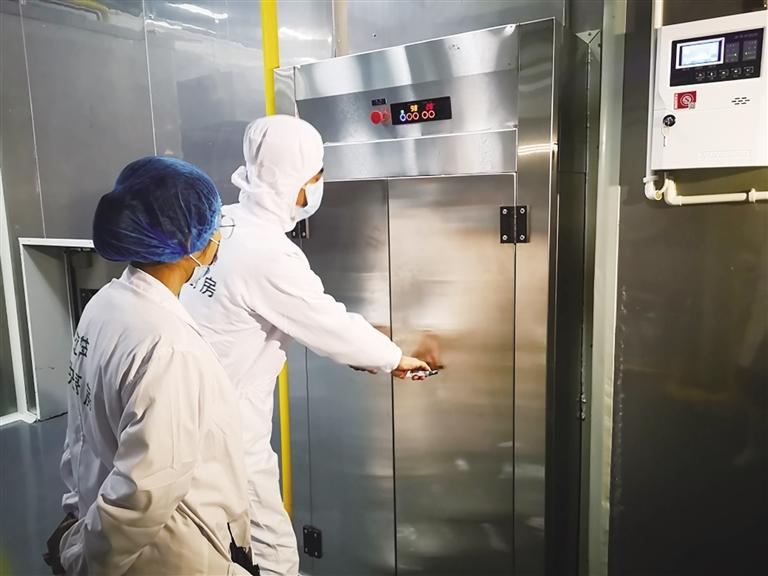 通過員工通道,在該廚房生產(chǎn)廠長甘文忠的指導(dǎo)下,記者穿上了白色工作服、戴上食品安全帽,換上高筒膠鞋,洗手消毒、測量體溫、隨身攜帶的手機、首飾全部摘掉后,通過腳踏池進入生產(chǎn)加工車間。