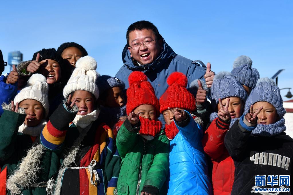 援藏教師潘杰和藏族學(xué)生在一起(2021年12月12日攝)。