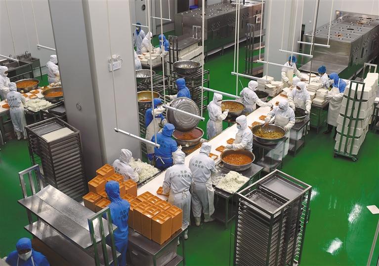 圖為凈土拉薩中央廚房內(nèi),工作人員在將飯菜裝盒。記者 洛桑 旦增蘭澤 王敏 攝