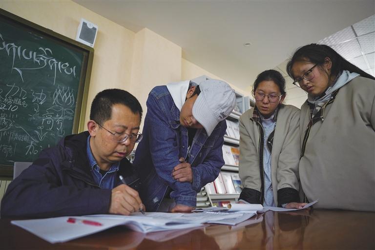 除了教室,閱覽室也是學(xué)習(xí)的好地方。在閱覽室,不少同學(xué)正奮筆疾書(shū),只聽(tīng)得見(jiàn)書(shū)頁(yè)翻動(dòng)和筆尖書(shū)寫(xiě)的“沙沙”聲。陽(yáng)光透過(guò)玻璃傾瀉在書(shū)桌上,暖暖地照在這些青春的面龐,把他們點(diǎn)綴成五月里最美的風(fēng)景。閱覽室的最里邊,一位老師正在認(rèn)真講解試卷上的難題,不一會(huì)兒同學(xué)們就露出了恍然大悟的表情?!拔液芟矚g來(lái)閱覽室學(xué)習(xí),這兒比教室更安靜些,可以讓我靜下心來(lái)做題?!睂W(xué)生扎西江村說(shuō)。
