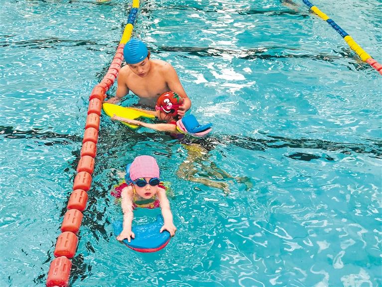 圖為青少年兒童在教練的指導下學習游泳。