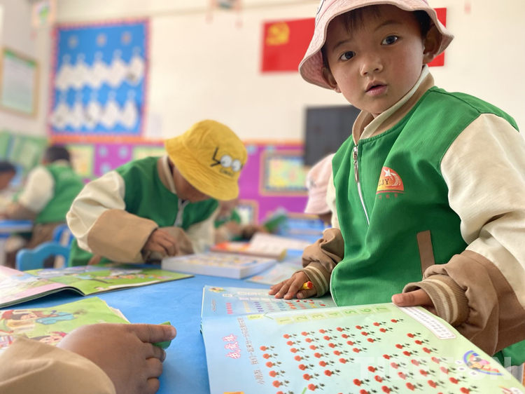 圖為西藏自治區(qū)日喀則市桑珠孜區(qū)江當(dāng)鄉(xiāng)雷貴村幼兒園孩子們翻閱書(shū)籍 攝影:王媛媛
