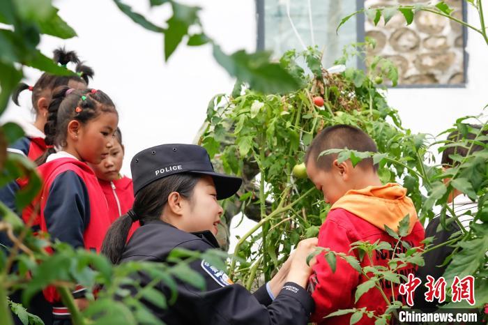 圖為亞東出入境邊防檢查站民警楊琳帶著龐達(dá)村雙語(yǔ)幼兒園小朋友認(rèn)識(shí)成熟了的西紅柿。 李錦輝 攝