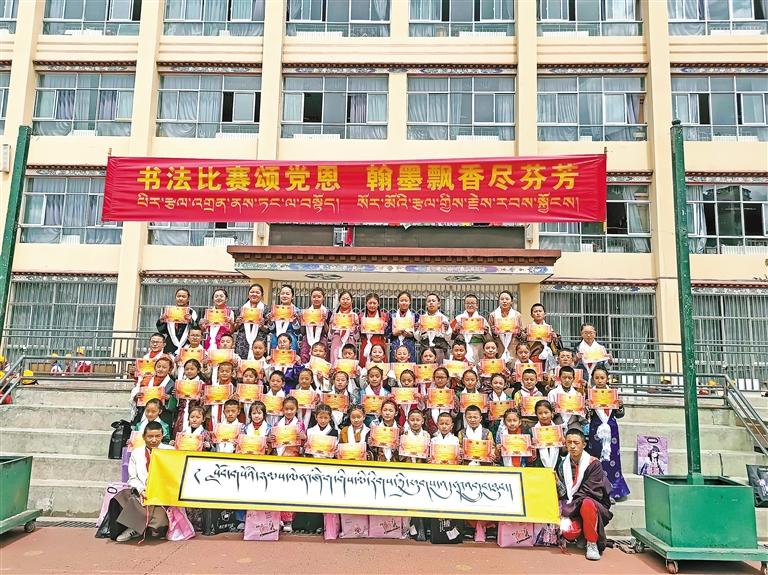 圖為在藏文書法比賽中獲獎(jiǎng)的學(xué)生們合影留念。 圖/文 記者 劉琳琳