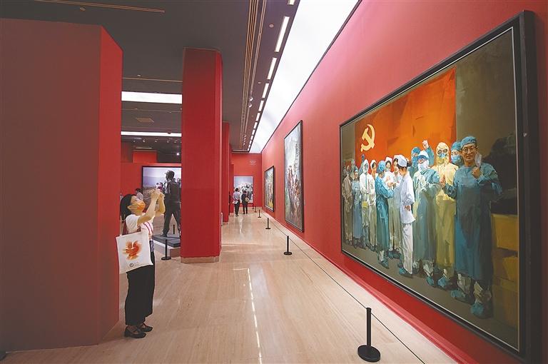 圖為9月2日,觀眾在觀看展覽中的作品《新生——浙里抗疫》。新華社記者 陳鐘昊 攝