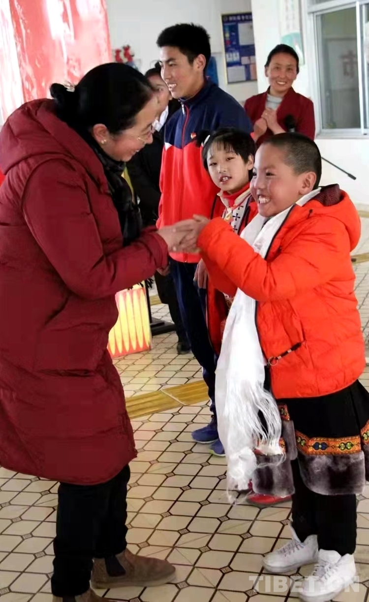 圖為次仁拉姆為那曲市特殊教育學校學生獻哈達,半蹲著跟學生握手,場面非常溫暖