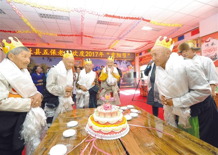 社會保障兜底一批。2021年,農(nóng)村居民最低生活保障標(biāo)準(zhǔn)達(dá)到5060元/年/人,城鎮(zhèn)居民最低生活保障標(biāo)準(zhǔn)達(dá)到10920元/年/人。圖為2017年10月28日,西藏自治區(qū)拉薩市達(dá)孜區(qū)特困人員集中供養(yǎng)服務(wù)中心為80歲老人們集體過生日。