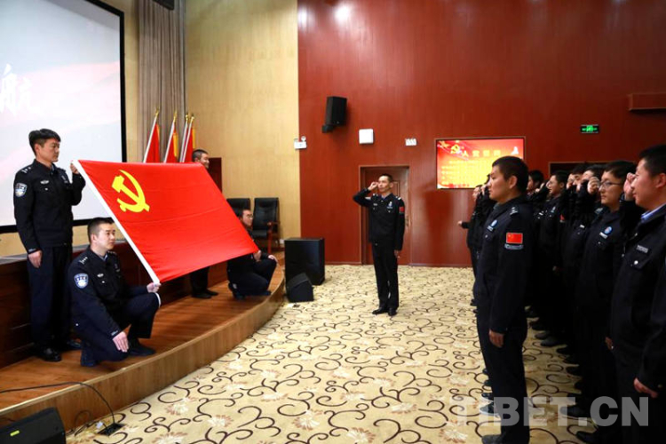 圖為西藏邊檢總站執(zhí)法調(diào)查支隊(duì)組織民警重溫入黨誓詞 攝影:劉明陽(yáng)