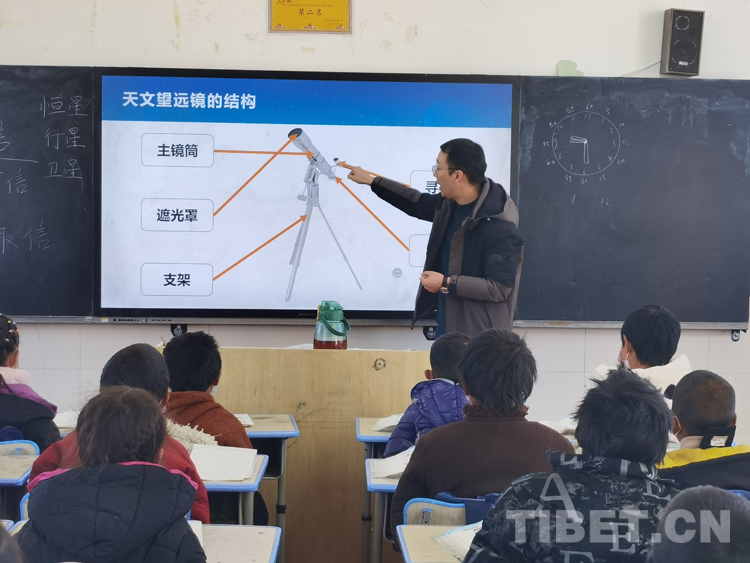 11月30日,王建煜受邀來到海拔4300多米的騾子溝小學(xué),帶著天文設(shè)備為牧區(qū)孩子們上了一節(jié)望遠(yuǎn)鏡觀測入門課。王建煜通過PPT展示了豐富的天文社團(tuán)活動,引起了孩子們強烈的好奇心和探索心。他介紹到,要想觀測到遙遠(yuǎn)的地方,必須要借助工具,而天文望遠(yuǎn)鏡,就是我們觀測星空的工具。