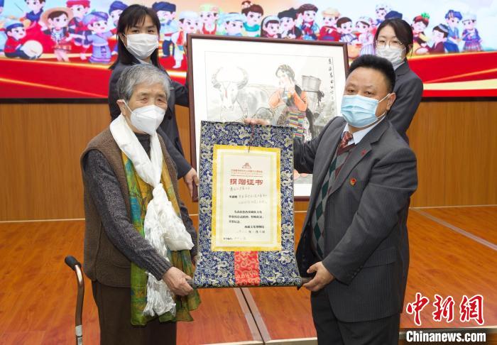 圖為活動(dòng)當(dāng)天知名畫家吳茜向中國(guó)藏學(xué)研究中心西藏文化博物館捐贈(zèng)西藏主題作品?!≈袊?guó)藏學(xué)研究中心供圖