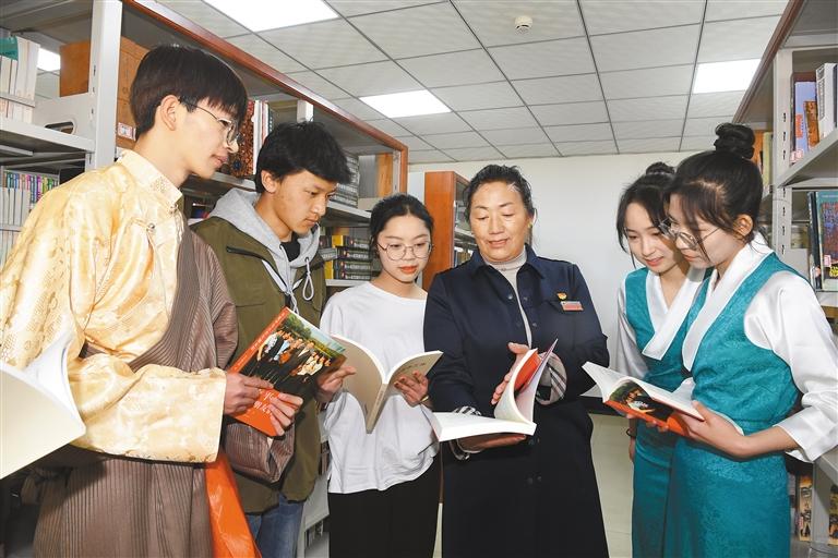 圖為在西藏大學(xué)圖書館,央宗老師和學(xué)生分享《習(xí)近平與大學(xué)生朋友們》一書。記者 李洲 攝