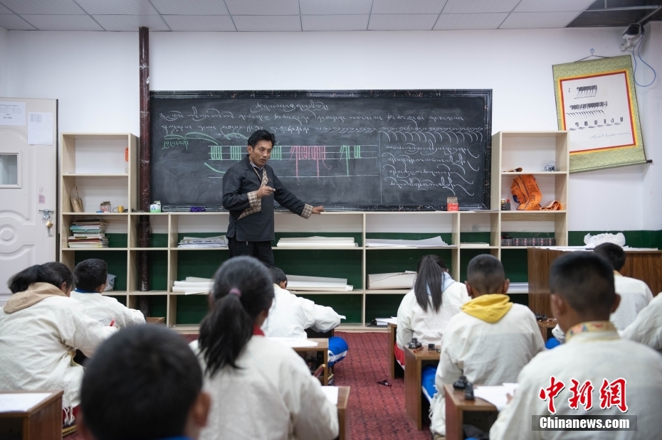 5月7日,西藏山南市,加查縣中學藏文書法興趣班的教師扎西達瓦給學生們上課。該興趣班由2名藏文教師任教,每周兩課時,利用自習課或晚自習時間為學生和教師授課。課程內(nèi)容包含執(zhí)筆、運筆、姿勢等基礎(chǔ)書寫技能,以及藏文中的烏金體、珠擦體、簇仁體、簇通體等各類字體的書寫方法。