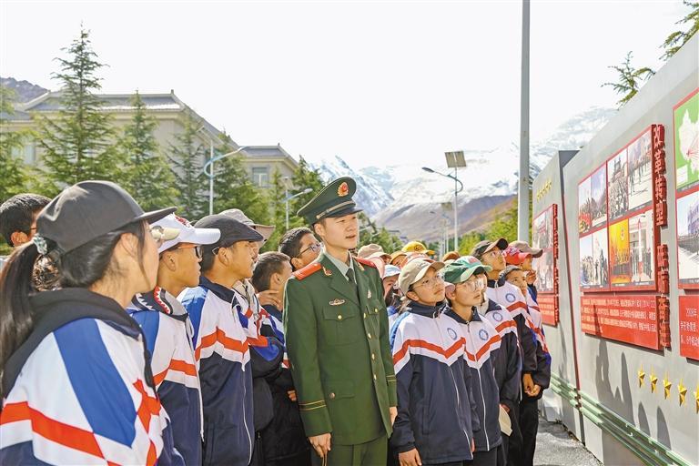 武警官兵帶領(lǐng)學(xué)生參觀營區(qū)。索朗旺堆 記者 旦增蘭澤 攝