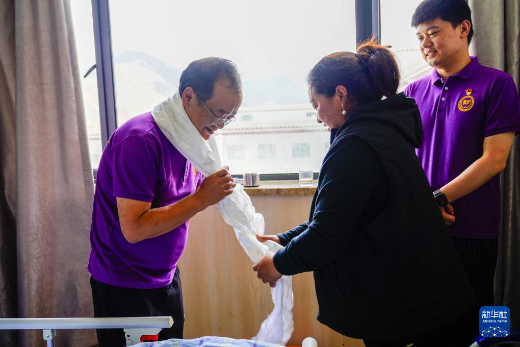 患者母親尼珍向醫(yī)護(hù)人員敬獻(xiàn)哈達(dá)以表感謝。 新華社記者 劉洪明 攝