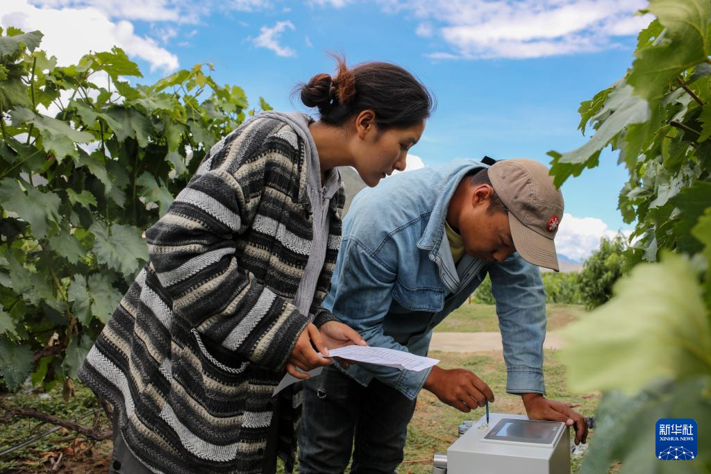 曲珍(左)在葡萄園里向技術(shù)員何志榮學(xué)習(xí)操作光譜儀(7月26日攝)。新華社記者 姜帆 攝