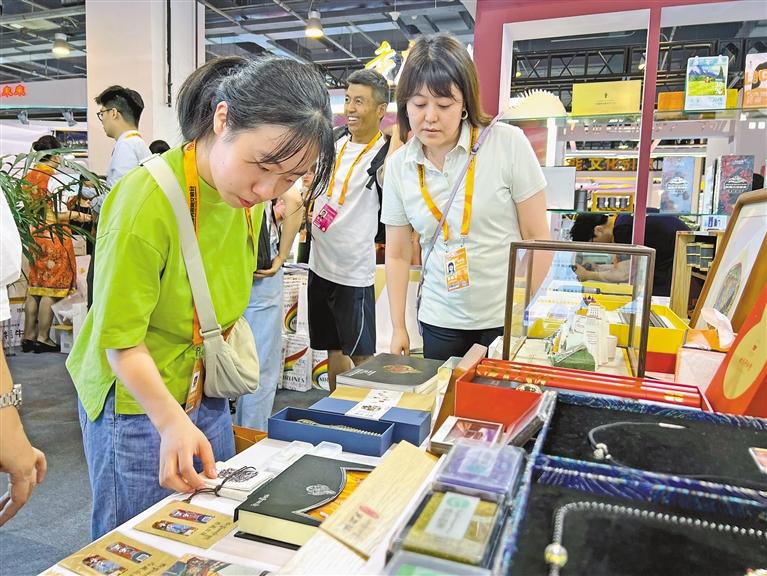 圖為觀眾在服貿(mào)會西藏展廳了解、挑選文創(chuàng)產(chǎn)品。記者 張姝 攝