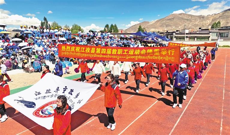 近日,日喀則市江孜縣教育系統(tǒng)舉辦以“奮斗教育路 建功英雄城”為主題的第四屆教職工運動會。本屆教職工運動會比賽項目眾多,競賽類項目有男女100米跑步賽、男女4×100米接力賽;田賽類項目有男女鉛球、男女跳遠(yuǎn)、男女一分鐘跳繩和女子一分鐘踢毽子比賽;傳統(tǒng)賽類項目有吉韌(藏式克郎球)、藏棋(國王與大臣)、男女拔河比賽、秀茲(藏骰一男一女混合);趣味賽類項目有陸地龍舟(男女混合)、旋風(fēng)跑(男女混合)、隔空取物(男女混合)、“乒”盡全力(男女混合);球賽類項目有男子足球和籃球、女子籃球比賽等項目。