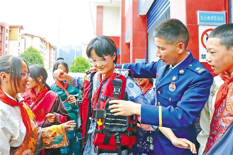 學(xué)生體驗水域救援裝備。記者 胡文 通訊員 西繞拉翁 袁勇彬 攝