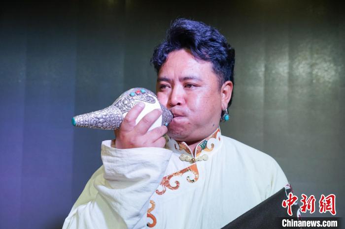 圖為樂團(tuán)成員吹奏吉祥海螺。馬銘言 攝