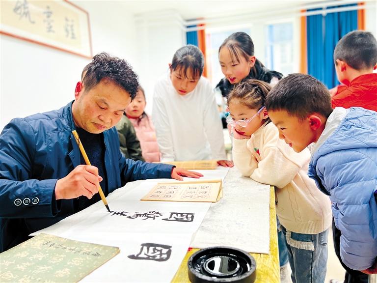 圖為流動少年宮進(jìn)鄉(xiāng)村活動中,少兒們展示自創(chuàng)的繪畫。
