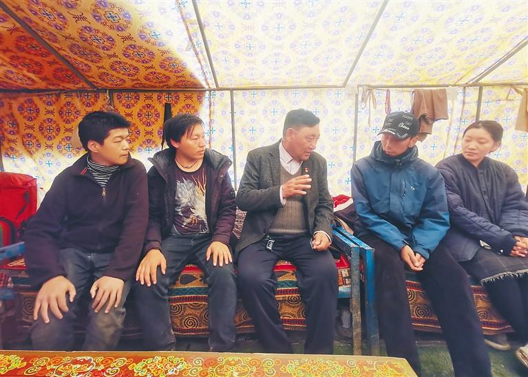 圖為“全國模范人民調(diào)解員”扎西次加(中)在那曲市比如縣恰則鄉(xiāng)孔瑪奪村蟲草采集點(diǎn)向群眾宣講法律知識。