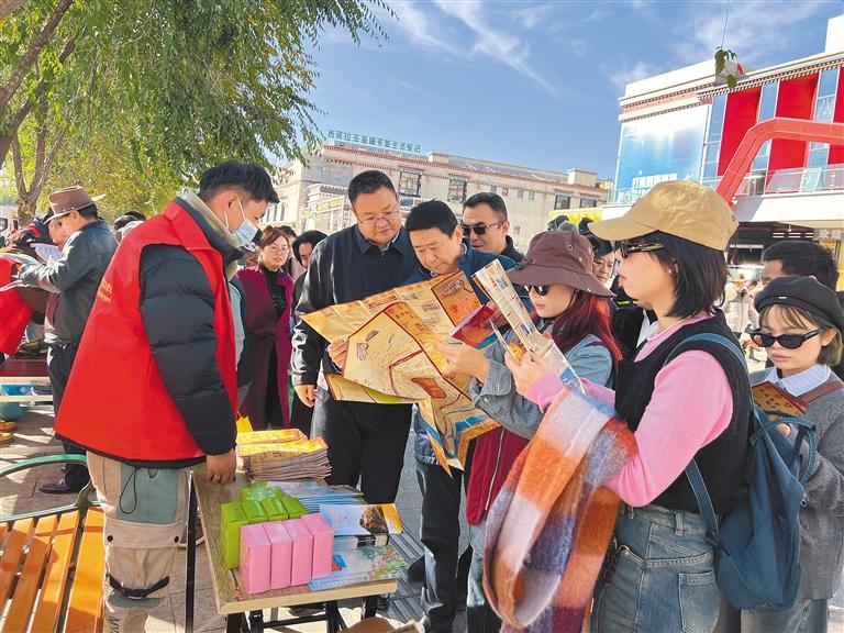 圖為工作人員向游客介紹拉薩旅游景點(diǎn)相關(guān)情況。記者 央金 攝