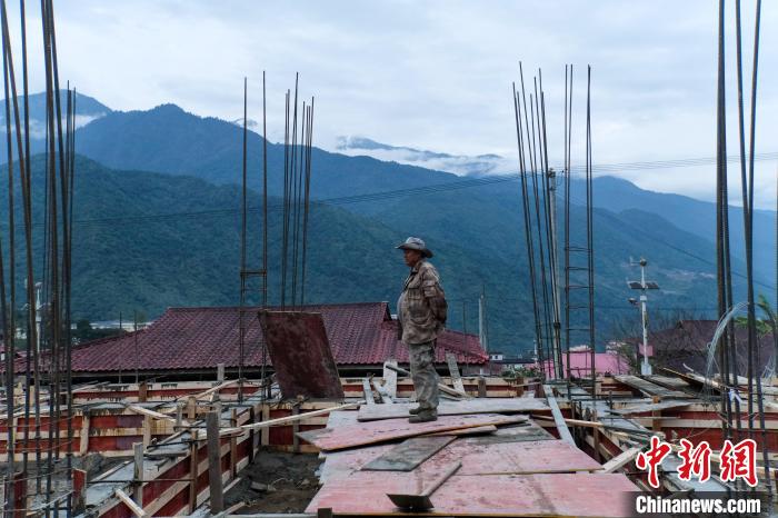 12月18日傍晚,墨脫縣門巴族村民新生在新建房屋地基上查看進(jìn)度?!≈行律缬浾?江飛波 攝
