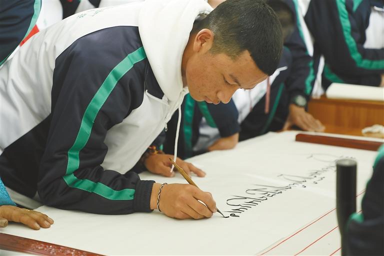 拉薩北京實驗中學教師洛桑多吉精通藏文書法,有著豐富的傳統(tǒng)藏文書法教學經(jīng)驗,他堅持長期輔導學生,讓學生在書法練習中陶冶性情,靜心修身;在書法進益的過程中感受傳統(tǒng)文化的魅力,提升學習能力。