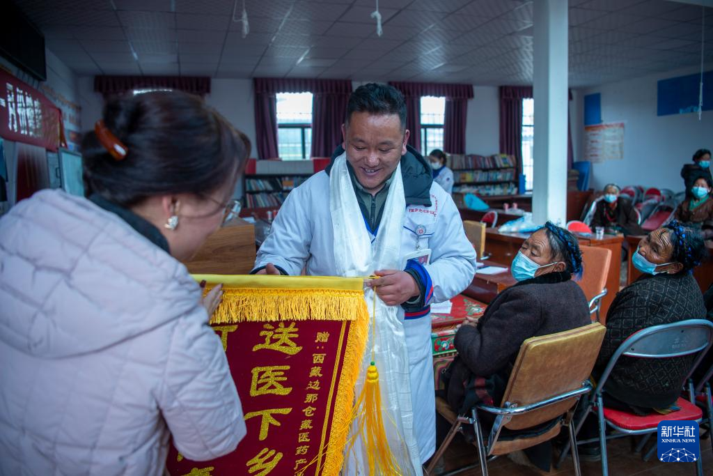 義診活動即將結(jié)束時,拉布村駐村工作隊為加央和同事們送來了錦旗。工作隊隊長邊巴卓瑪講:“義診活動很有意義。醫(yī)生們到了村里,能解決農(nóng)牧民看病難的問題,我們真的很感謝他們?!?/p>