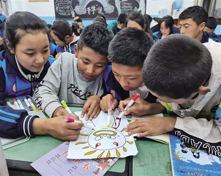 “通過(guò)拉巴卓瑪?shù)倪@幅畫(huà),我了解到她是一個(gè)很有想法的孩子,她很清楚自己想要什么。課程剛開(kāi)始時(shí),我觀察到她一個(gè)人坐在角落里,低著頭,也不怎么和旁邊同學(xué)說(shuō)話(huà),但是通過(guò)這個(gè)課程的開(kāi)展,她會(huì)在課后主動(dòng)跑來(lái)和我說(shuō)她近期遇到的困惑,我感覺(jué)到她正逐漸敞開(kāi)心扉,這與我們當(dāng)初開(kāi)設(shè)這個(gè)課程的初心是一樣的。我們就是希望可以通過(guò)這些課程,讓當(dāng)?shù)氐膶W(xué)生在心理方面得到更多的開(kāi)導(dǎo)、正視自己的情緒,并從中去獲得一些能量,所以現(xiàn)在看到她的變化,我很高興?!蓖蹑兼谜f(shuō)。