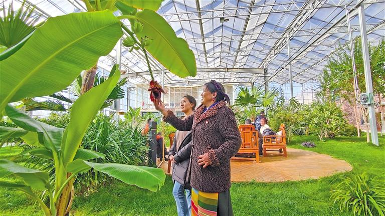 隆冬時(shí)節(jié),山南市扎囊縣阿扎鄉(xiāng)的南方植物展示館內(nèi),一派郁郁蔥蔥的景象。椰子樹(shù)、鶴望蘭、凌霄花相映成趣。該館是藏草萬(wàn)畝植物種苗繁育基地的一部分,可為參觀游客提供林草科普知識(shí)講解,為學(xué)生開(kāi)設(shè)生態(tài)課堂進(jìn)行研學(xué)實(shí)踐等。