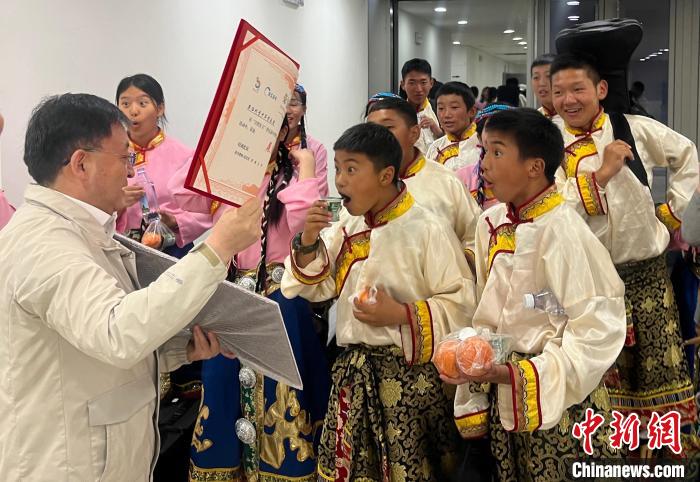 圖為果洛州青少年管樂(lè)團(tuán)的成員們領(lǐng)取獲獎(jiǎng)證書(shū)?!暵?攝