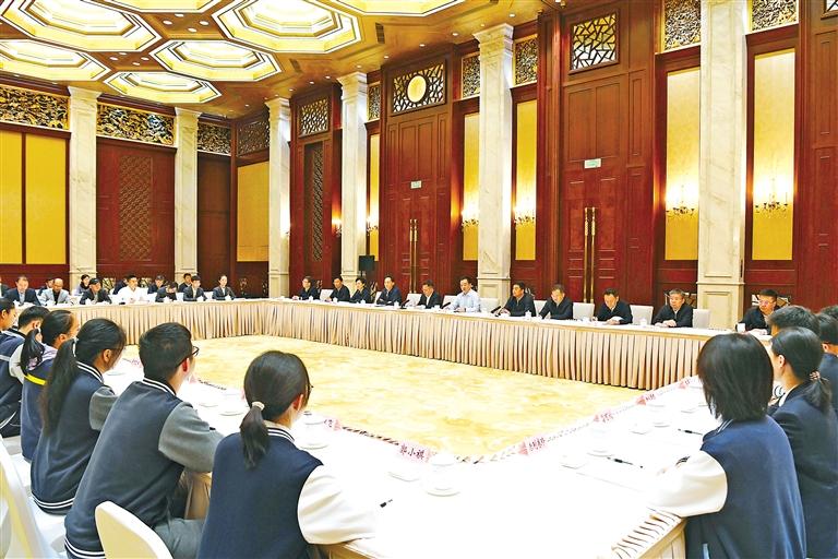 5月10日至11日,西藏自治區(qū)黨政代表團赴上海學(xué)習(xí)考察。這是王君正看望西藏班師生、西藏籍高校畢業(yè)生就業(yè)代表,聽取他們在上海學(xué)習(xí)、工作情況。 記者 李洲 攝