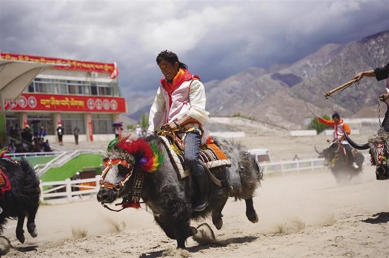 此時(shí),賽場另一邊傳來歡呼,循聲望去,原來是本屆運(yùn)動(dòng)會(huì)的賽牦牛正在進(jìn)行。雖然牦牛生性溫和,但讓它們聽命令奔跑,也并不容易。記者了解到,參加本屆運(yùn)動(dòng)會(huì)的牦牛均由主人精挑細(xì)選,主人一聲吹哨,輕微地蹬腳,牦牛就會(huì)按指令向前行進(jìn),顯得默契十足。但偶爾也會(huì)發(fā)生小狀況,比如牦牛分不清方向擠成一團(tuán),跑著跑著就停頓休息,或者原路返回等,引得觀眾頻頻發(fā)笑。