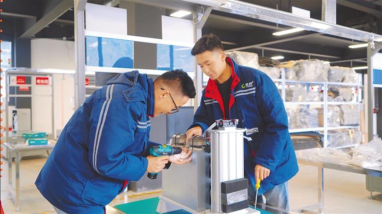 在西藏清匠電器科技有限公司生產(chǎn)車間,來自多頗章鄉(xiāng)嘎東團結(jié)新村六組村民朗嘎崔成正和與他一同入職的員工學習安裝制氧機。2023年大學畢業(yè)以來,朗嘎崔成一直待業(yè),偶爾打零工補貼家用,今年3月,嘎東團結(jié)新村就業(yè)服務站為他爭取了這個就業(yè)崗位。