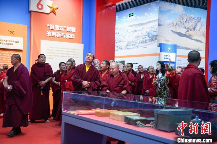 圖為西藏佛學(xué)院僧尼學(xué)員參觀(guān)全國(guó)對(duì)口援藏30周年成就展現(xiàn)場(chǎng)。貢嘎來(lái)松 攝
