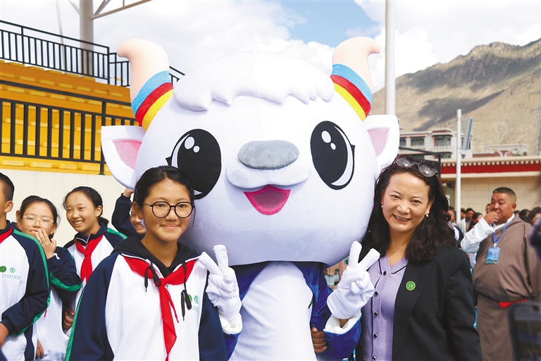 拉薩北京實驗中學(xué)學(xué)生與學(xué)校吉祥物“小京羚”合影留念。