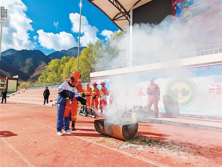 圖為消防員教學(xué)生正確使用滅火器。鄧珠平措 記者 貢秋曲措 攝
