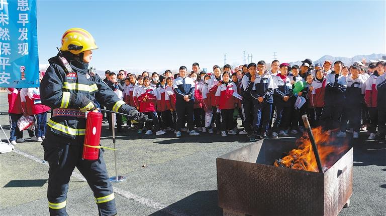 消防員為學(xué)生示范滅火器使用方法。記者 旦增嘎瓦 攝