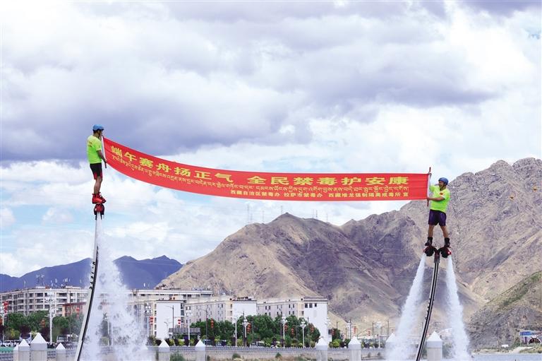 在牛皮船(龍舟)賽精彩進(jìn)行的同時(shí),自治區(qū)禁毒辦、拉薩市禁毒辦、堆龍強(qiáng)制隔離戒毒所聯(lián)合開(kāi)展了以“防范青少年藥物濫用”為主題的“傳統(tǒng)文化+禁毒”宣傳活動(dòng),有效構(gòu)建常態(tài)化“滴灌式”禁毒宣傳教育模式。此外,還通過(guò)“雪域禁毒”抖音平臺(tái)、“西藏禁毒”微信視頻號(hào)進(jìn)行了禁毒有獎(jiǎng)答題互動(dòng)直播,吸引了1萬(wàn)余人的關(guān)注及線(xiàn)上互動(dòng)答題,擴(kuò)大了活動(dòng)覆蓋面、影響力?,F(xiàn)場(chǎng)設(shè)置的禁毒主題龍舟打卡點(diǎn),成為了當(dāng)天活動(dòng)的一大亮點(diǎn),過(guò)往群眾紛紛打卡留念,在喜慶的端午氛圍中接受了禁毒宣傳教育。來(lái)自全國(guó)160名選手組成的10支龍舟隊(duì)伍和20支牛皮船隊(duì)伍在拉薩河上共同角逐,自治區(qū)禁毒辦也組建了“破浪禁毒舟”龍舟隊(duì)參賽,進(jìn)一步擴(kuò)大了禁毒宣傳工作的影響力。比賽現(xiàn)場(chǎng),一艘艘牛皮船和龍舟如離弦之箭,在拉薩河上飛馳。禁毒運(yùn)動(dòng)員們齊心協(xié)力,隨著鼓手的節(jié)奏奮力劃槳,水花四濺,場(chǎng)面十分壯觀(guān),劃出了禁絕毒品的氣勢(shì)。