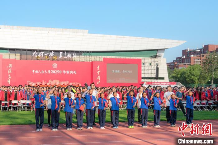 6月23日,中國人民大學(xué)舉辦2025年畢業(yè)典禮,畢業(yè)生代表與西藏日喀則定日縣措果鄉(xiāng)中心小學(xué)學(xué)生代表同升國旗。(中國人民大學(xué)供圖)