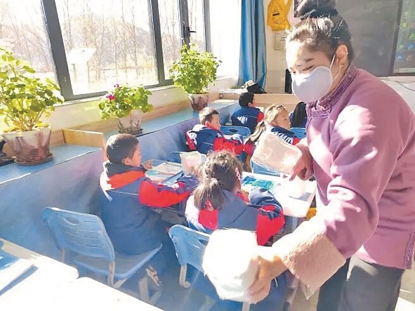圖為工作人員為學(xué)生發(fā)放宣傳手冊(cè)、學(xué)習(xí)用品等。記者 央金 攝