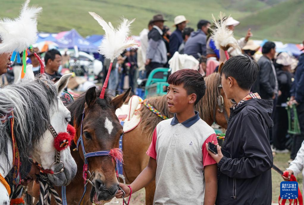 7月23日,一名小騎手欣賞對手的賽馬。新華社記者 晉美多吉 攝