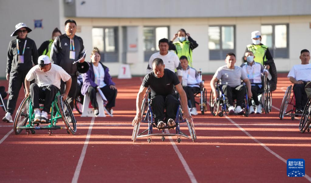 這是8月19日堆龍德慶縣代表隊(duì)選手西繞(前中)在50米輪椅速度賽中。新華社記者 晉美多吉 攝