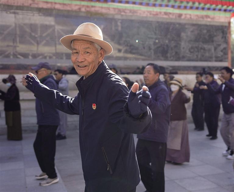 歡樂的鍋莊、悠揚(yáng)的朗瑪堆諧、節(jié)奏輕快的健身操……每天早晨,拉薩宗角祿康公園內(nèi)總是人聲鼎沸、熱鬧非凡,在公園的各處遮陽棚下聚集了不少老年人,他們身著特色藏裝,隨著音樂的節(jié)奏,整齊劃一地跳著鍋莊舞,每個(gè)人的臉上洋溢著幸福的笑容,載歌載舞的身影、和藹可親的笑臉共同映照著他們幸福的晚年生活。
