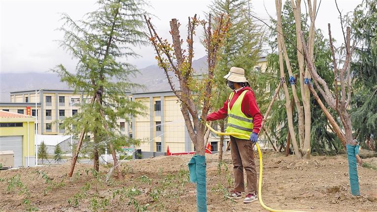 拉薩云天湖公園北側(cè),工人在給樹苗澆水。