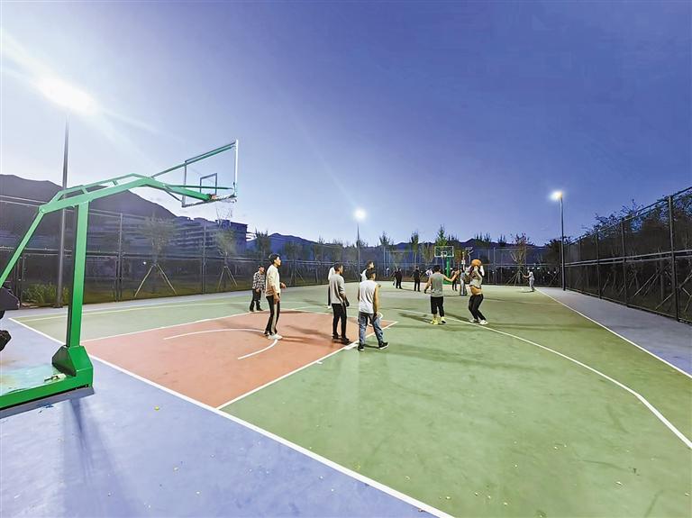 晚上,人們在拉薩云天湖公園中心籃球場打籃球。
