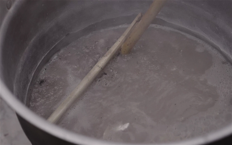 用牛糞灰加水煮制。