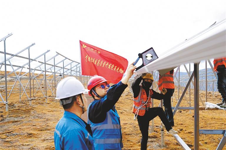 圖為華電西藏才朋光儲二期項(xiàng)目黨員先鋒隊(duì)的黨員們在施工現(xiàn)場進(jìn)行維護(hù)作業(yè)。 記者 袁海霞 鄭璐 攝